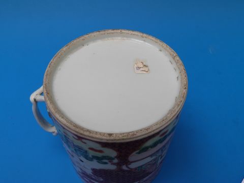 A 18thC large Chinese mug with figural decoration of a lady at a window, garden scenes etc and an intertwined branch handle