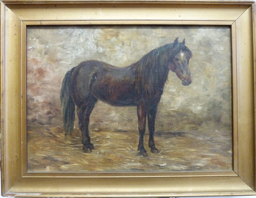 An oil on board of a pony in a stable, in gilt frame (16 x 22.5cm)