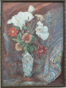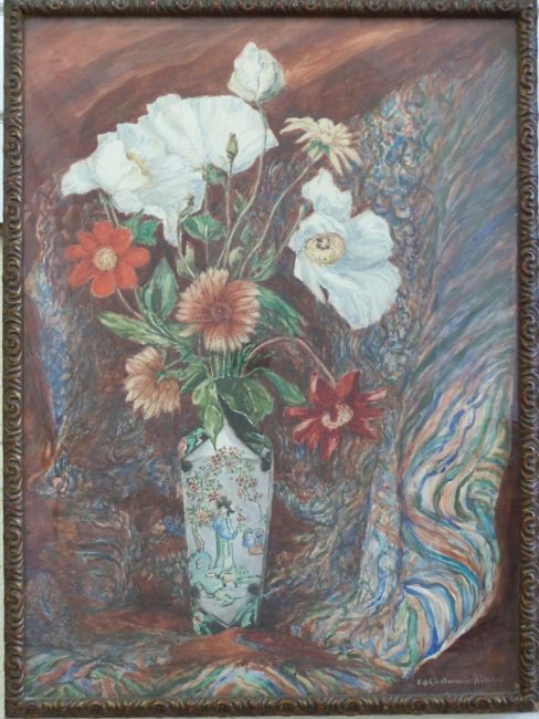 Chatwood Aiken (20thC): Watercolour on paper laid on board of poppies and flowers in a Chinese vase. Gallery labels verso 'Hillside Westbury on Trym', £8 and 8 shillings, shipper's labels with possible date 1927 (51 x 39cm)