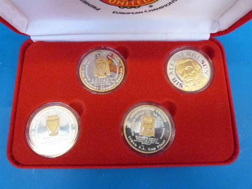 A Manchester United bronze effect figure of Roy Keane limited edition 243/500 together with a Manchester United medallion collection in original box