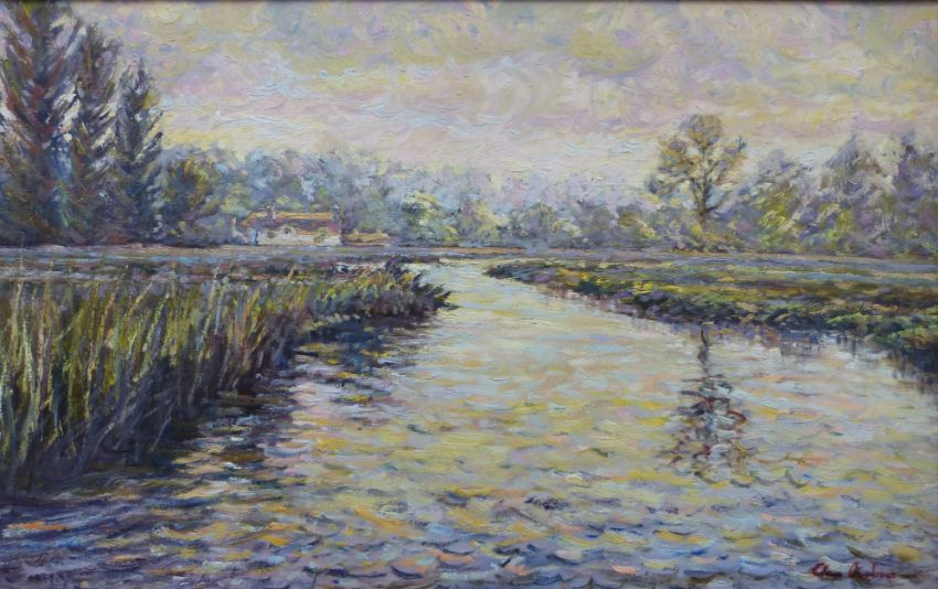 Clare Gordon impressionist style 'Chilbolton' oil on board (36cm x 60 cm)