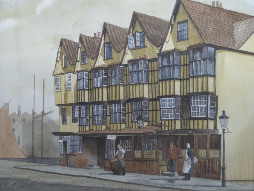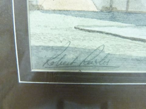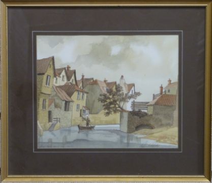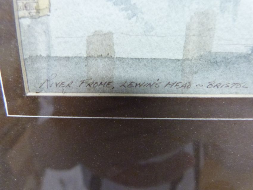 A pair of watercolours depicting 'Old Bristol' the River Frome and a street by harbour scene by Robert Rewlers (20cm x 25cm each)