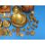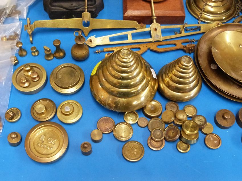 Two stacks of curved edge flat stacking weights together with a large selection of postal, troy and other brass weights including small apothecary weights and a quantity of scale parts