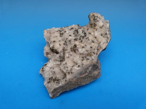 A geological sample of small white crystals with scattered iridescent stone and fools gold, approximately 17cm in length
