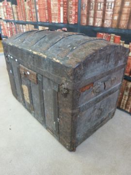 A wooden metal bound 19thC steamer trunk with White Star label (L87 x W52 x H64cm)