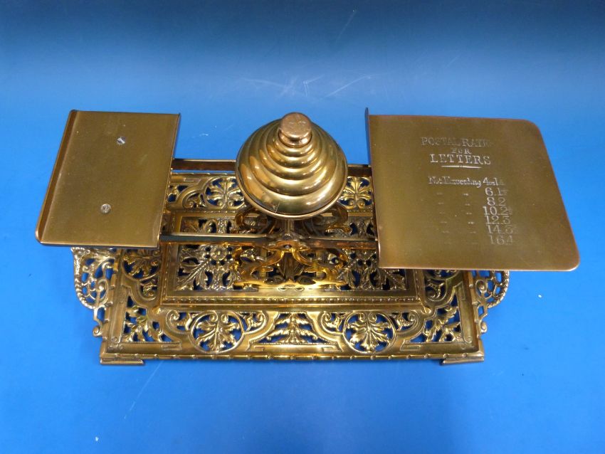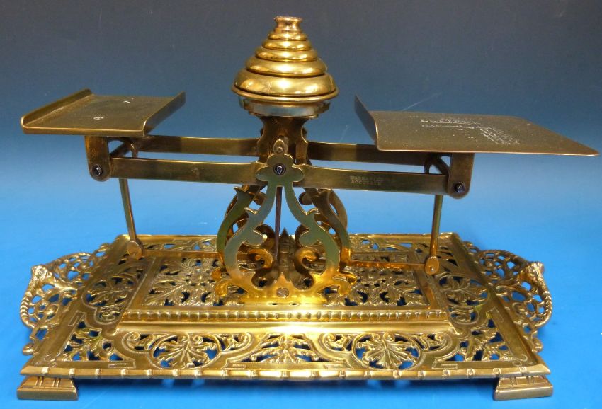 A set of Townsend & Co. brass postage scales, marked to pan with letter rates with stack of wights to centre, the cast base with foliate and stylised head decoration.