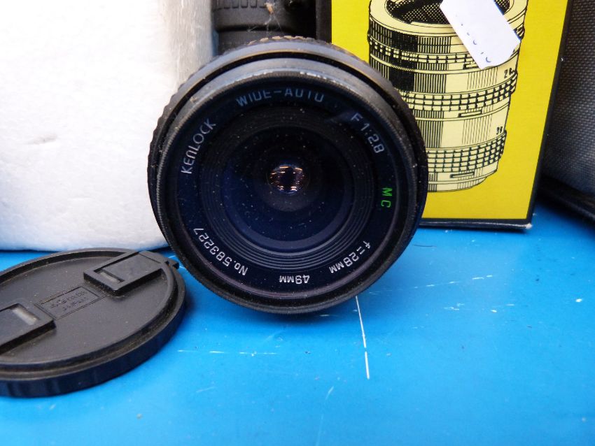 An Olympus OM-2N SLR camera and lenses to include Centon 1:8.0 f = 500mm mirror lens, Prinzflex 80 -200mm 1:4.5 - 5.6 and others