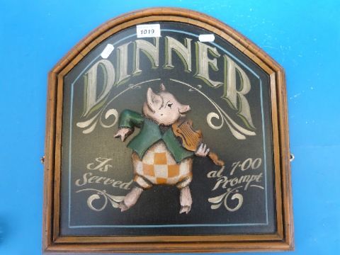 Two novelty display signs, one for 'Dinner is Served', with a pig with violin, the other of a cat in a dress for 'Cream'