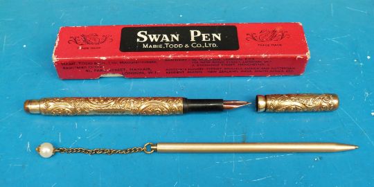 A boxed gilt swan pen with chased decoration, together with a ladies' pen decorated with a faux pearl