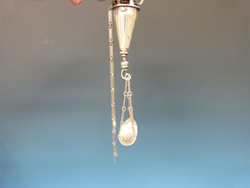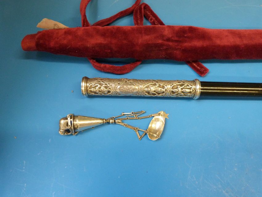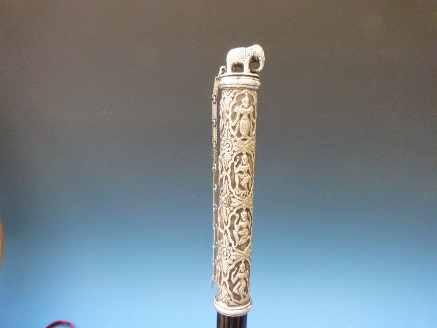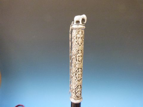 A ebonised white metal handled walking cane, the handle containing a small spring balance