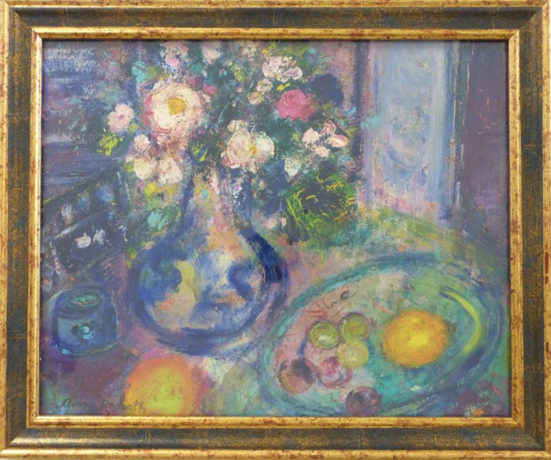 Anne Redpath: framed and glazed still life of flowers and fruit, signed (29cm x 23cm)
