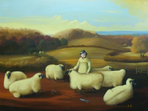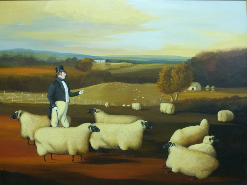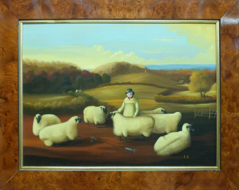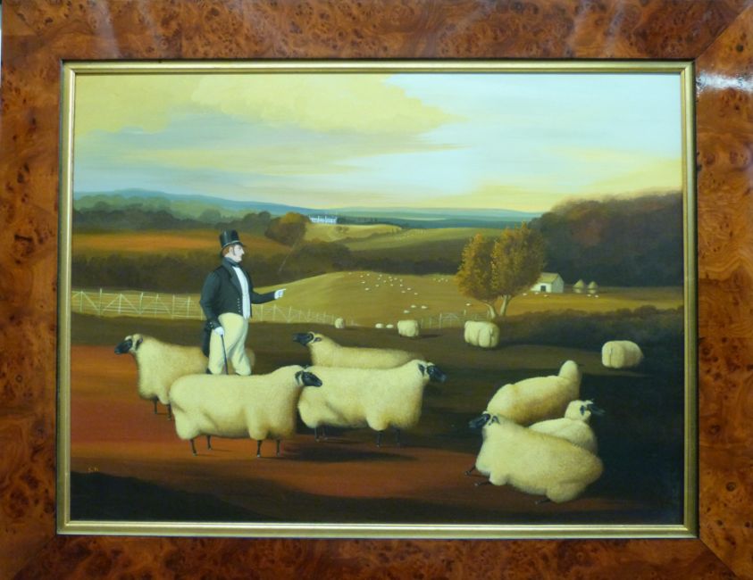 Two framed paintings on board of sheep, one with gentleman farmer the other with shepherd in birds eye maple style frames. Signed SA (43cm x 60cm)
