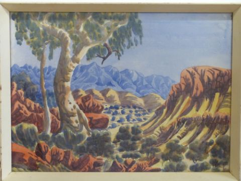 Otto Pareroultja (Australian aboriginal,1914-1973), Hermannsburg School watercolour outback landscape (27 x 37cm) together with Rex Battarbee book 'Modern Australian Aboriginal Art' (26 x 36)