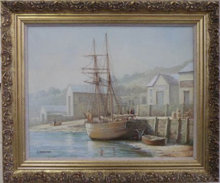 A Markham: Oil on canvas of a sailing ship at dock (39cm x 49cm)