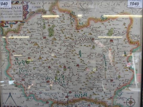 A framed map of Wiltshire, William Kip from Cowden's Britainnia c1607 to verso