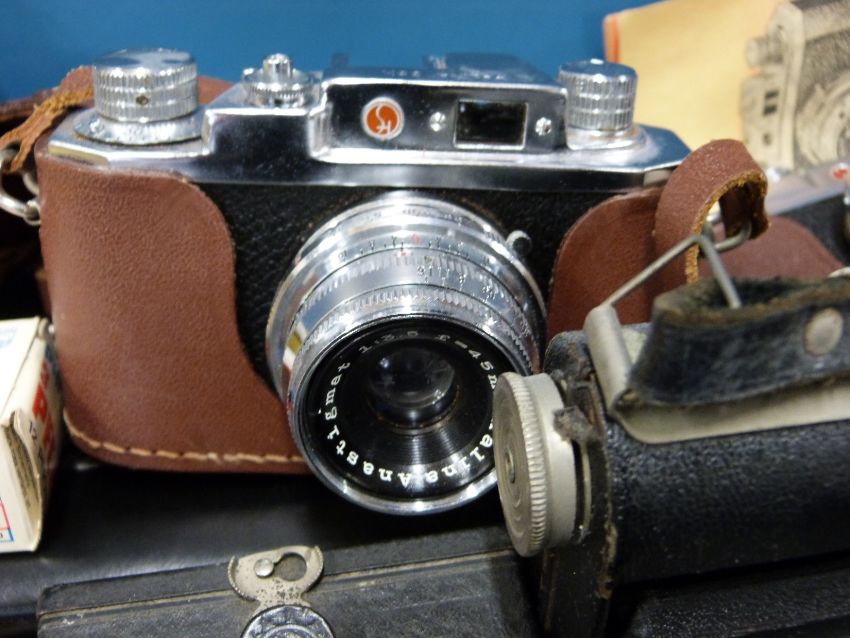 A collection of vintage cameras including folding Brownie, Halina etc