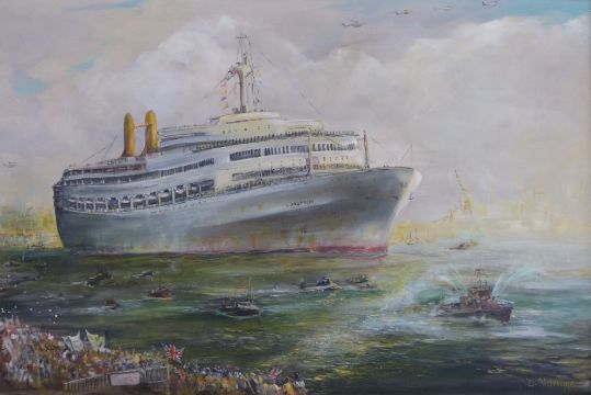 D Aldridge: Oil on canvas of SS Canberra returning home from the Falklands (59cm x 70cm)