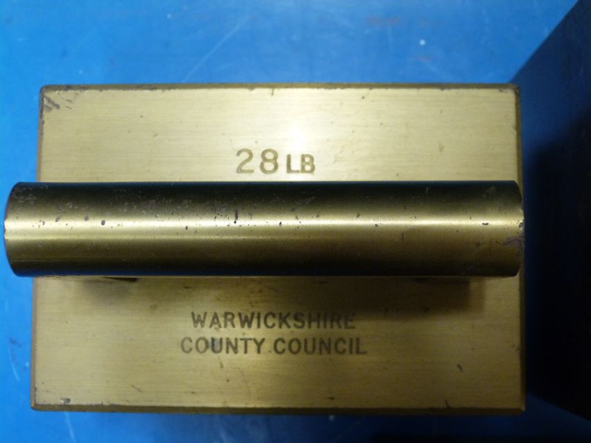 A run of three Warwickshire County Council standard weights, comprising 56lb, 28lb and 14lb. each of rectangular design with bar handles