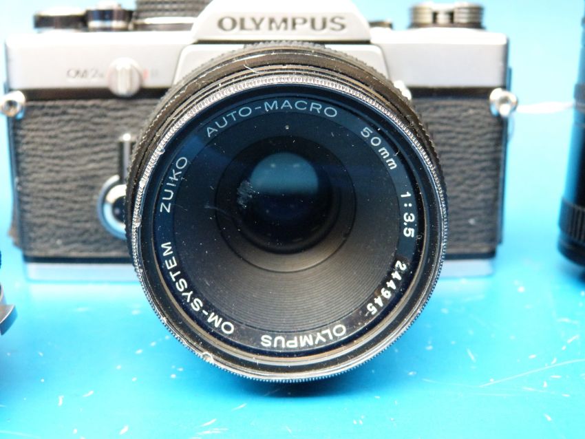 An Olympus OM - 2N camera together with two further lenses, extender tubes etc