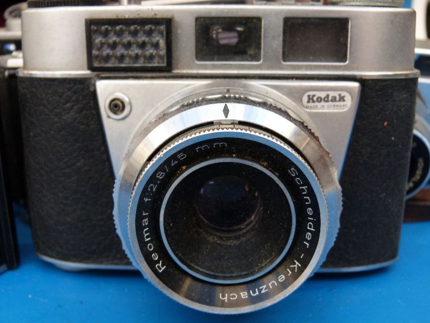 A box of vintage cameras including Zeiss, Ikon, Contaflex, Kodak Retinette