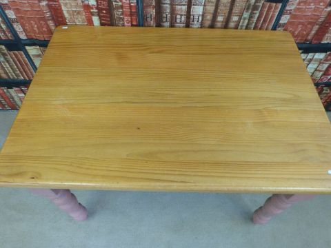 A pine kitchen table with pink painted legs (L122 x W85 x H77cm)