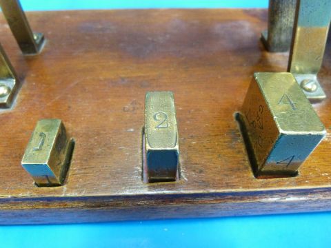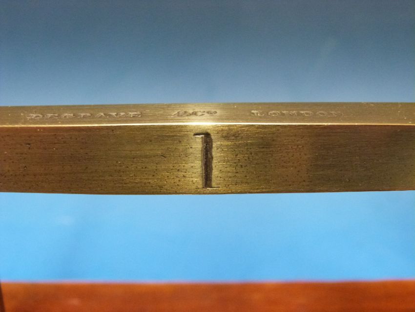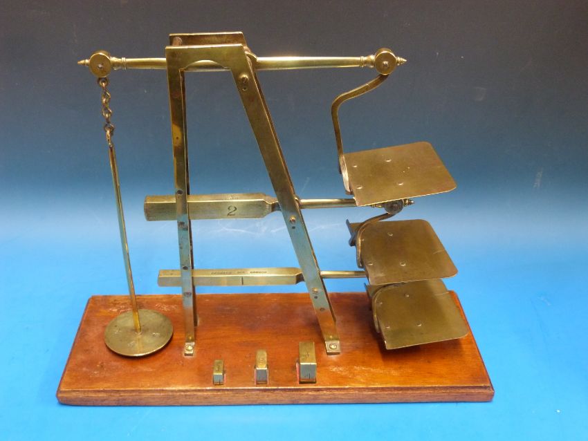 A three tier GPO ladder postage scale by Degrave & Co London, stamped to lower beams and 4oz pan GP0 and broad arrow, the base mounted with 1, 2 and 4oz weights