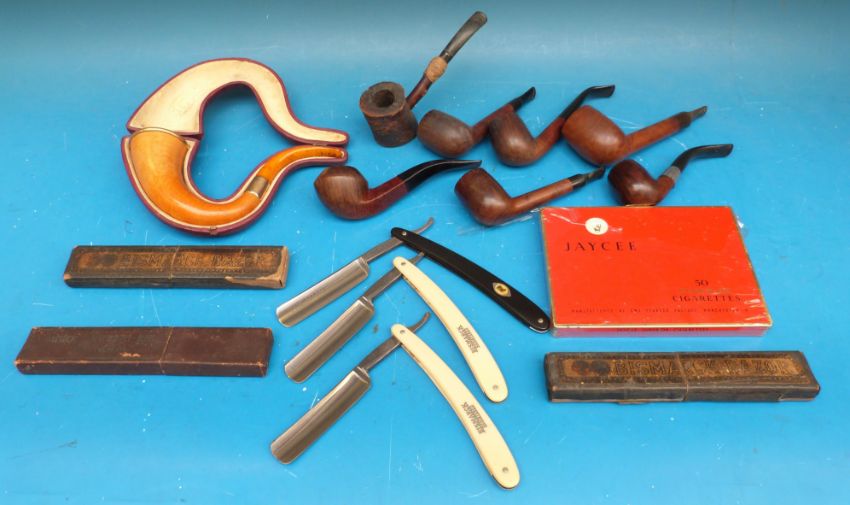 A collection of Briar pipes to include Colonel Henry Fraser Lovat, a cherry wood 'rustic' example etc together with a case London Meerschaum example with amber stem and and gold plated collar etc, and three boxed cutthroat razors