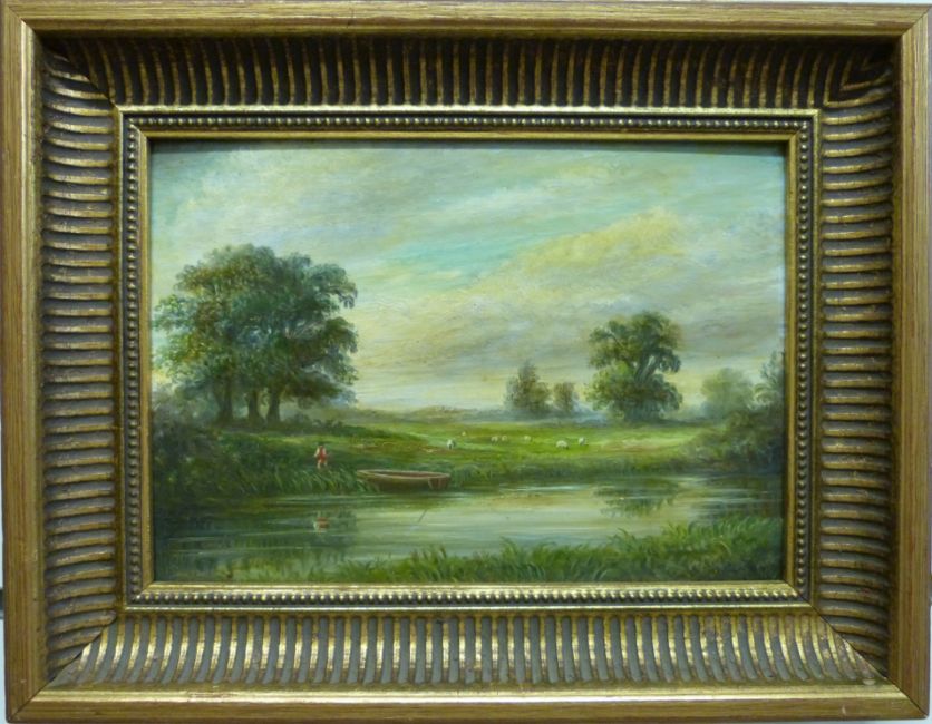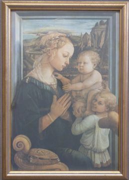 A pair of oriental floral watercolours on silk together with an oil on canvas of a doll like girl with flowers signed Kenney, a print of Madonna and child in classical Italian style and an oilgramme of a riverside scene (approximately 30cm x 41cm)