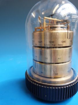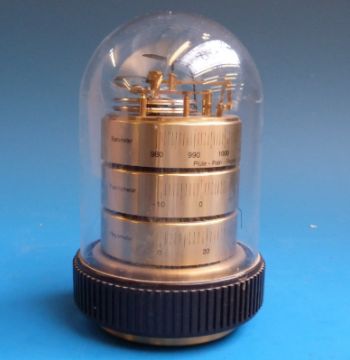 A Barigo desk top barometer, thermometer and hygrometer under a dome