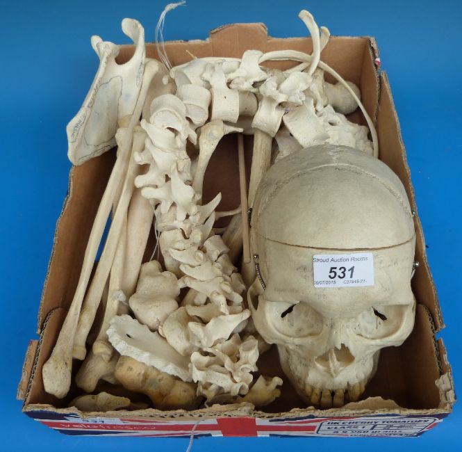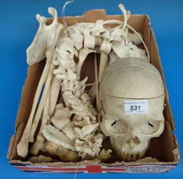 A part human skeleton to include articulated skull, vertebral column, ribs, tibia and fibula, femur, hand, foot, radius etc (almost half a skeleton)