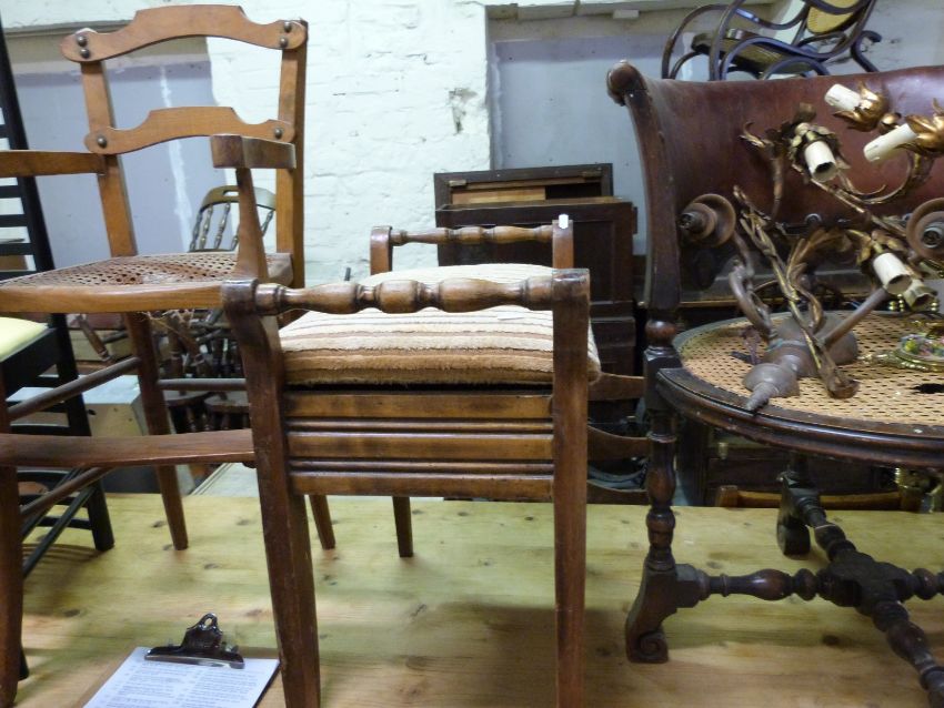 An assortment of six chairs to include Mackintosh style, high chair, piano stool, two dining chairs etc