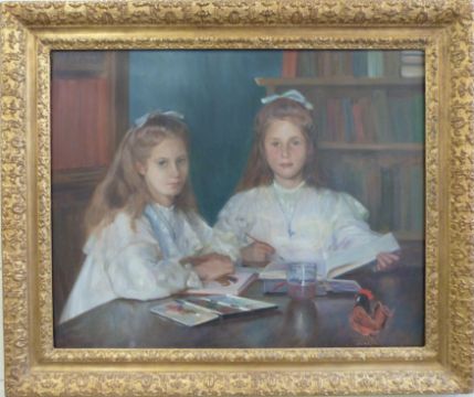 Alexander MacDonald RA: Oil on canvas of two girls painting in a library, signed and dated 1905 top left. The girls in the picture are Eleanor and Margaret Little of the Vicarage, Sampford Courtenay, Devon and as neither had children the painting passed to their nanny, the grandmother of the person from whom the vendor purchased the painting circa 2005. A quantity of photographs of the two, the house etc are included in the lot (60 x 75cm)