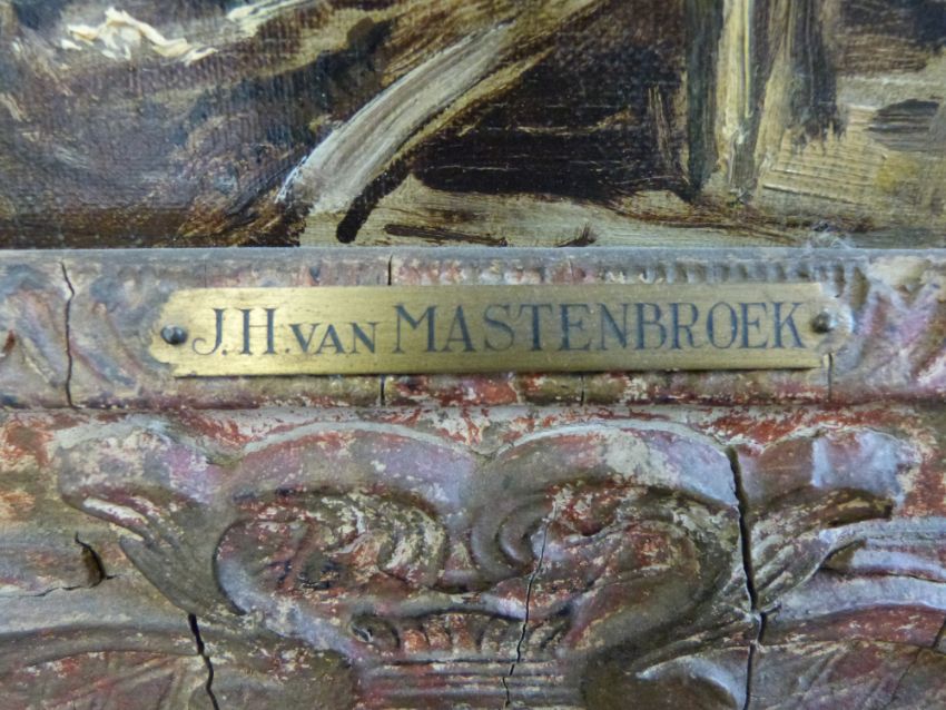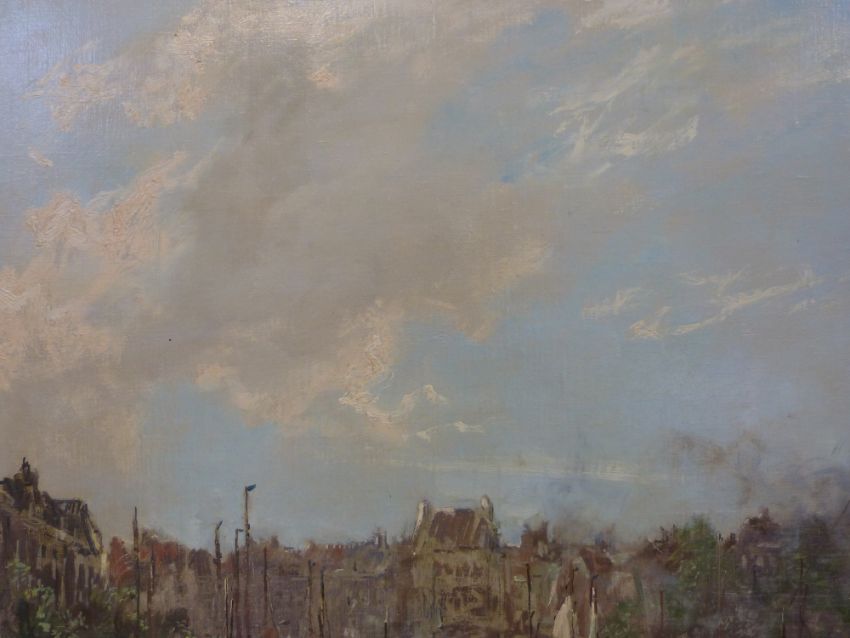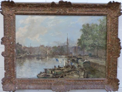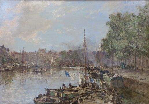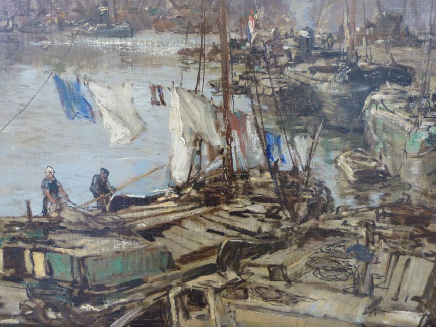 Johann Hendrik van Mastenbroek (1875-1945): Oil on canvas of busy Rotterdam river scene with barges, signed and dated 1942 lower right, in gilt frame, with label verso giving details of the painting (69cm x 98.5cm)