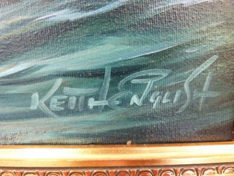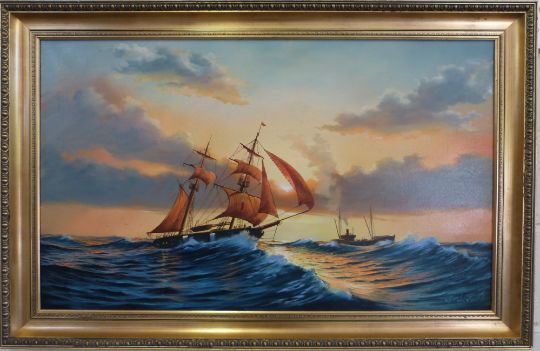 Keith English: Oil on canvas of sailing ships and steam ship at sea (60cm x 101cm)