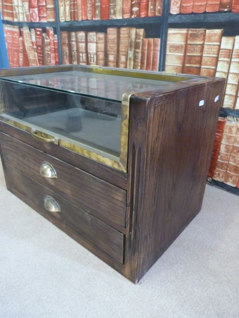 A haberdashery shop counter top display cabinet with lift up glazed top and two doors below (W67cm x D41cm x H48cm)