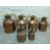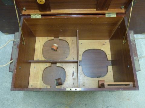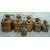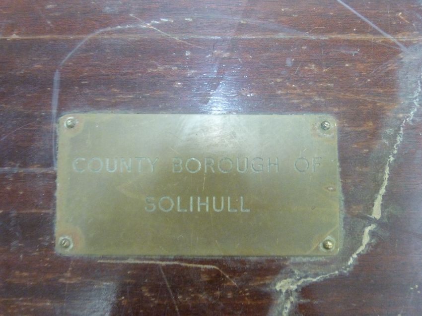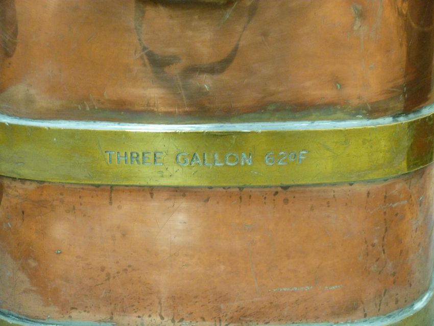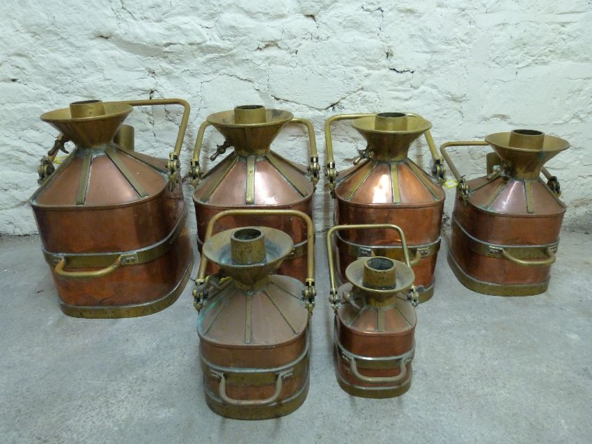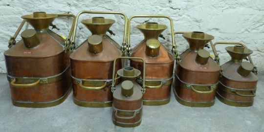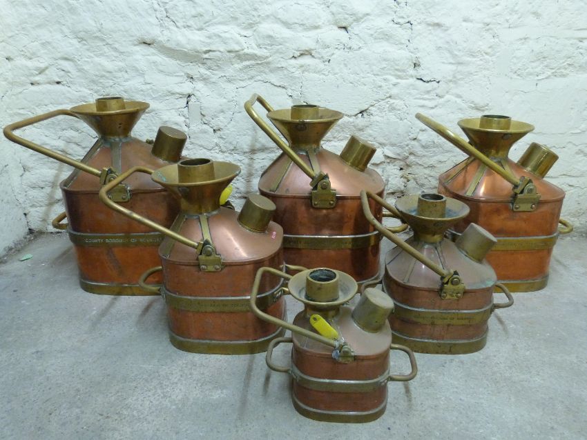 A set of six County Borough of Solihull copper and brass Chekpump petrol measures contained within three fitted mahogany cases, one for the five gallon, one for four and three gallon and the final case for two, one and half gallon measures, with various rubber and aluminium caps, each measure and outside of each box marked County Borough of Solihull