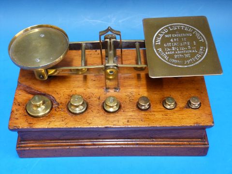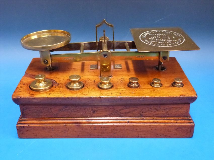 A set of S. Mordan & Co. postage scales having postage rates to pan, the mahogany base fitted with cylindrical weights