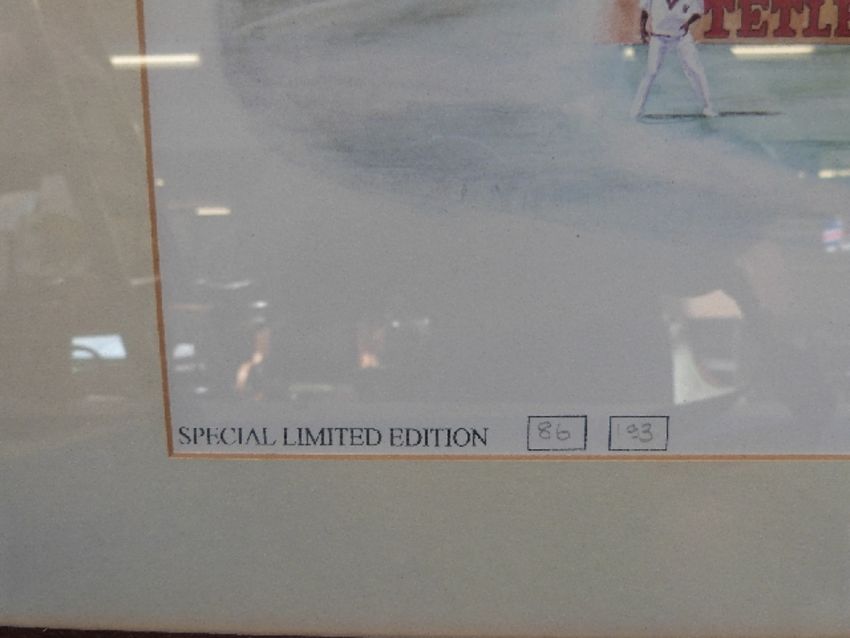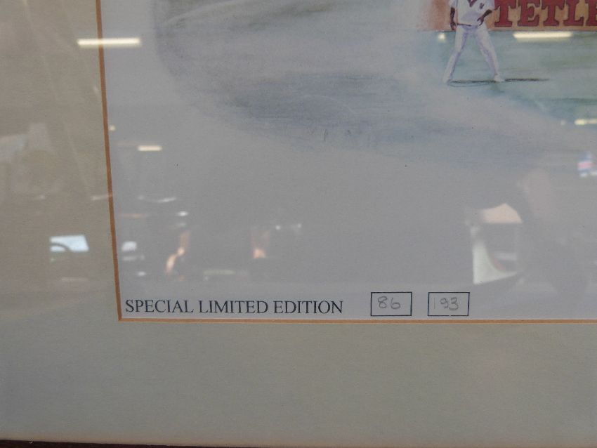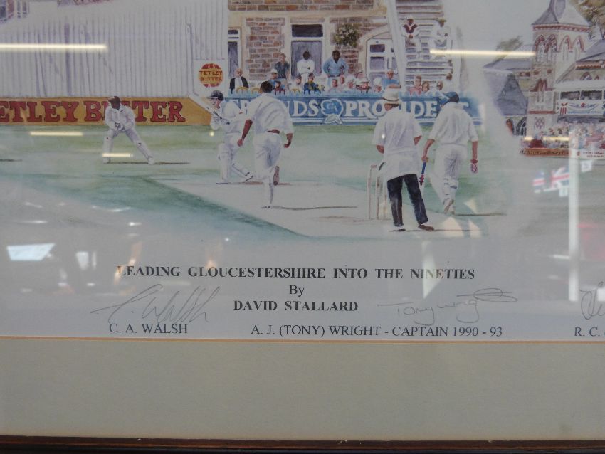 A framed picture by David Stallard, 'Leading Gloucestershire Into the Nineties' signed by the artist as well as CA Walsh, A. J. (Tony) Wright, R. C. (Jack) Russell and D. Stallard limited edition 86 of 193