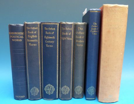 Five volumes of 'The Oxford Book of Poetry' to include English Romantic Verse, Light Verse, 19thC Verse, Children's Verse and Modern Verse, together with Wordsworth's 'Poetical Works' and Kipling's 'Verse 1885 - 1932 - The Inclusive Edition'