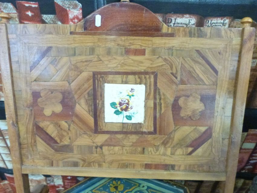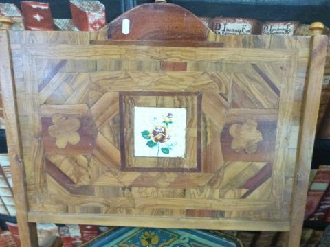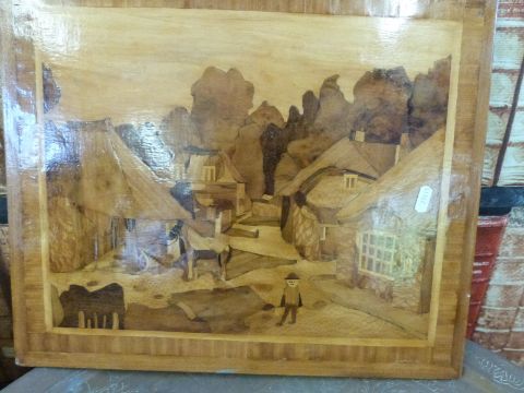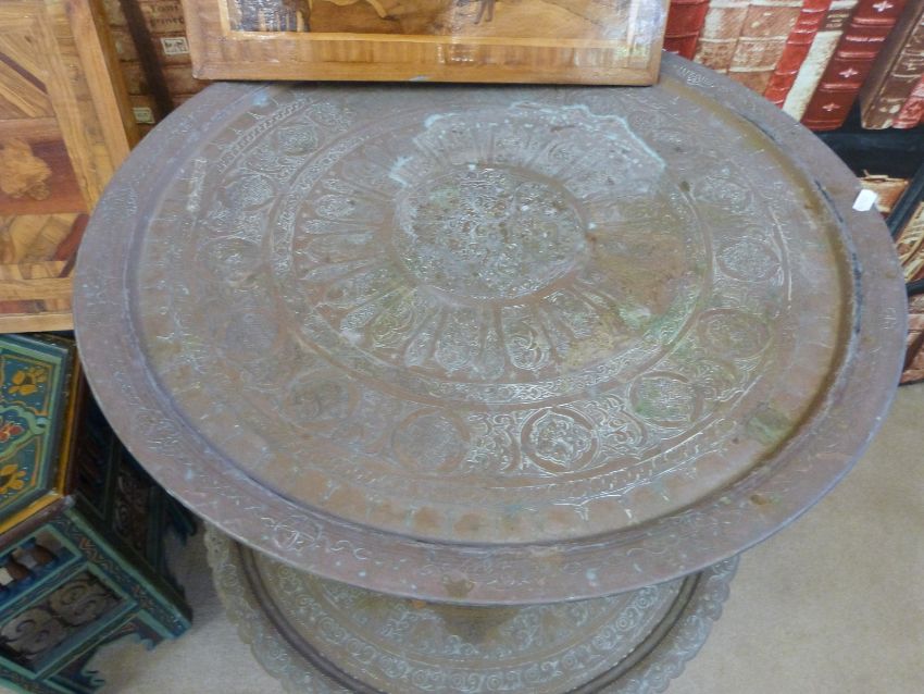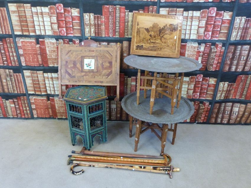 Two brass topped folding tables, hexagonal painted table, two inlaid panels and a quantity of walking sticks