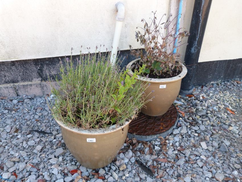 A pair of ceramic pots with lavender and standard honeysuckle plants
