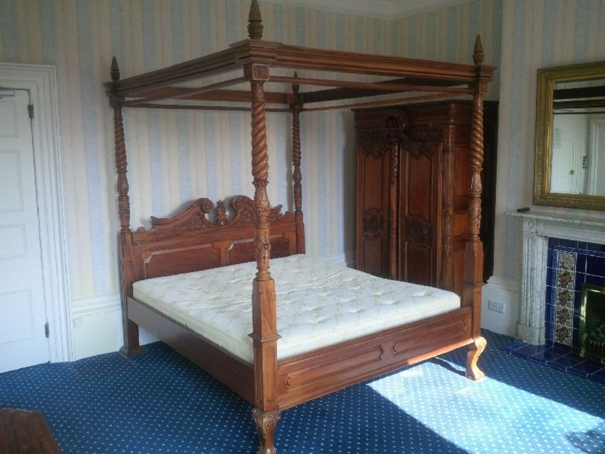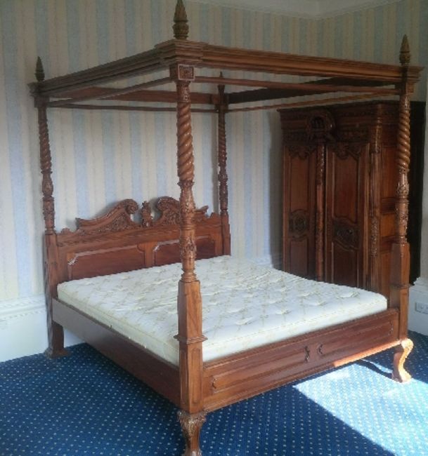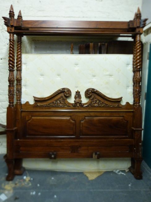 A French carved walnut four poster bed with all fittings (approx H248cm x W190cm)