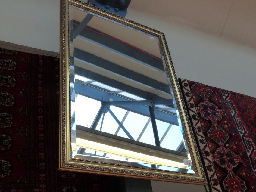 Two framed wall mirrors, one with bevelled glass, both in gilt stucco style frames, each 80cm x 56cm