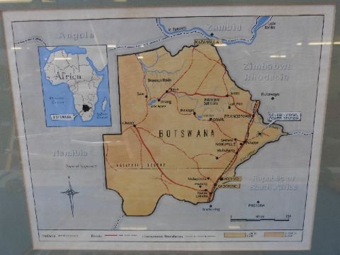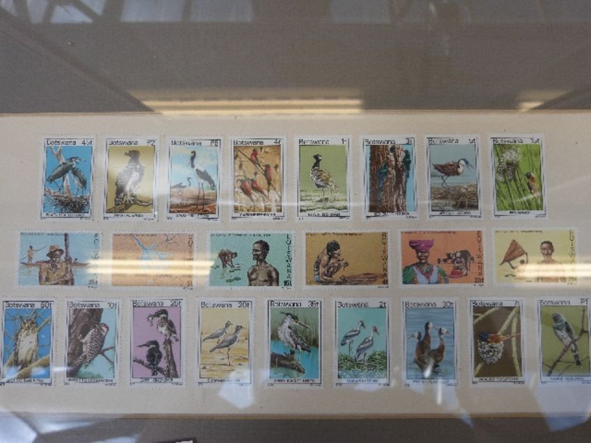 A framed Botswana map, framed stamps and a partially filled cigar band album