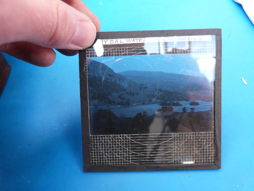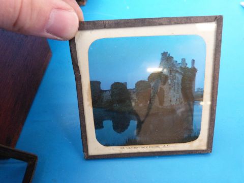 Three wooden cases containing magic lantern slides including Furness Abbey, Kern Knotts, waterfalls of Scotland, Sir Walter Scott, together with other scenes of Scotland, Lock Awe, Mull etc. Some in colour