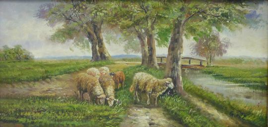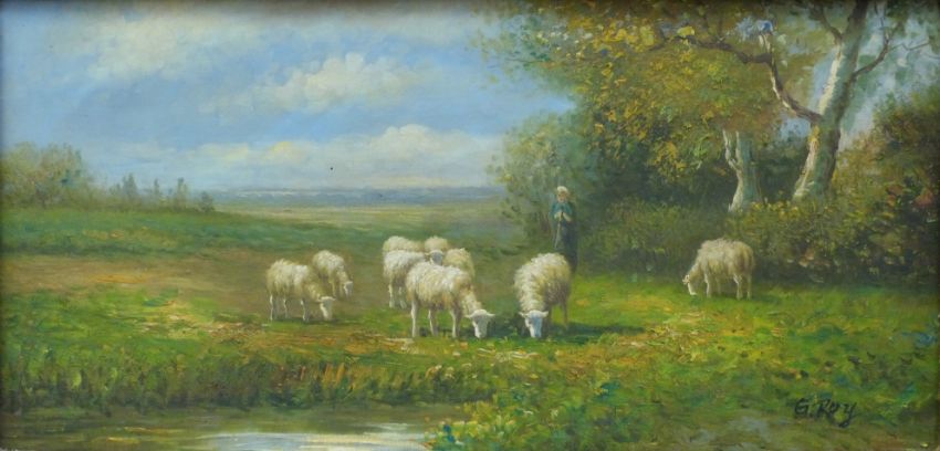 G. Roy: A pair of oils of pastoral scenes with sheep, both signed, in heavy frames (19cm x 39cm)