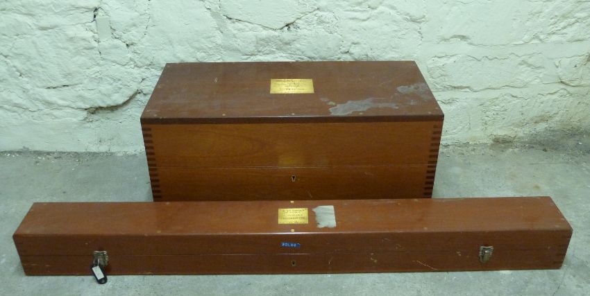 A mahogany case with brass plaque marked County Borough of Solihull Local standard weights 20kg to 1mg, Avery DeGrave London England and another case marked County Borough of Solihill Standard yard and metre Avery DeGrave, London England (both empty)