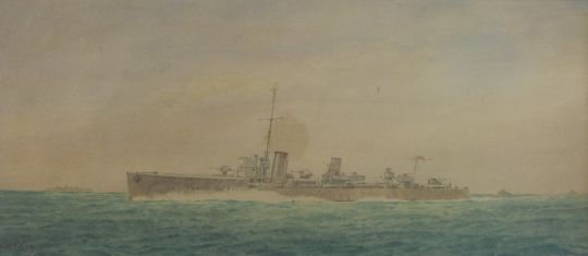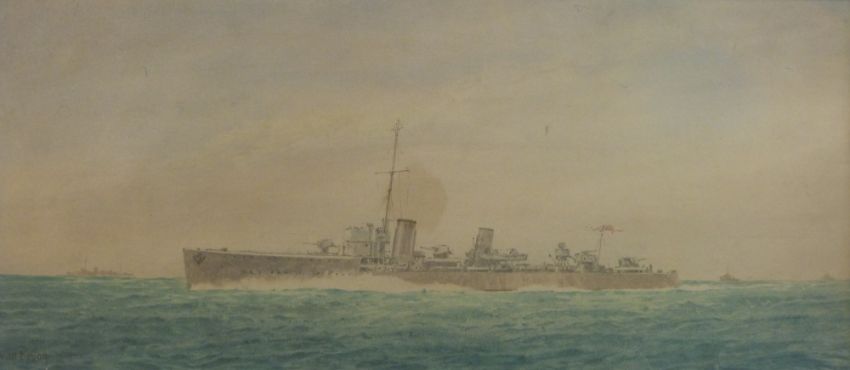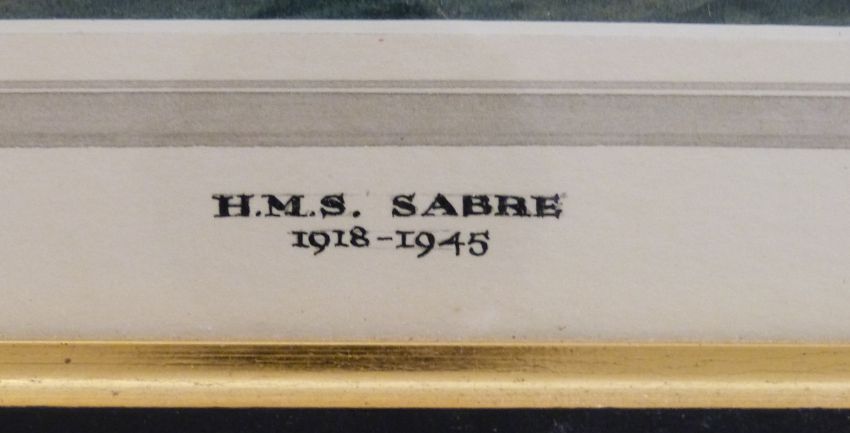Irwin Bevan: Watercolour of HMS Sabre (1918-1945) with additional information verso (20cm x 44cm)