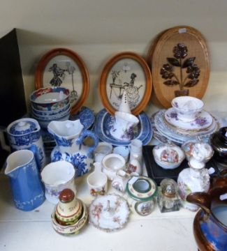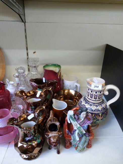 A large quantity of ceramics and glass including Cranberry glass jug, Goss crested ware, Chinese figure, Beswick palm jug, Masons, Wedgwood, George Jones etc