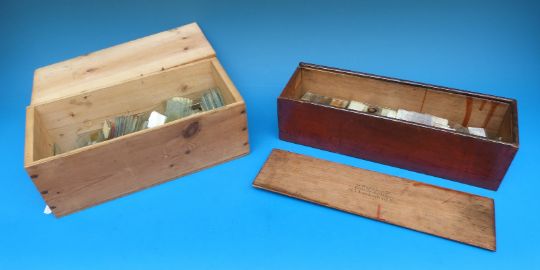 Two oblong wooden boxes of microscope specimen slides including pathology, physiology, botanical, entymology etc.